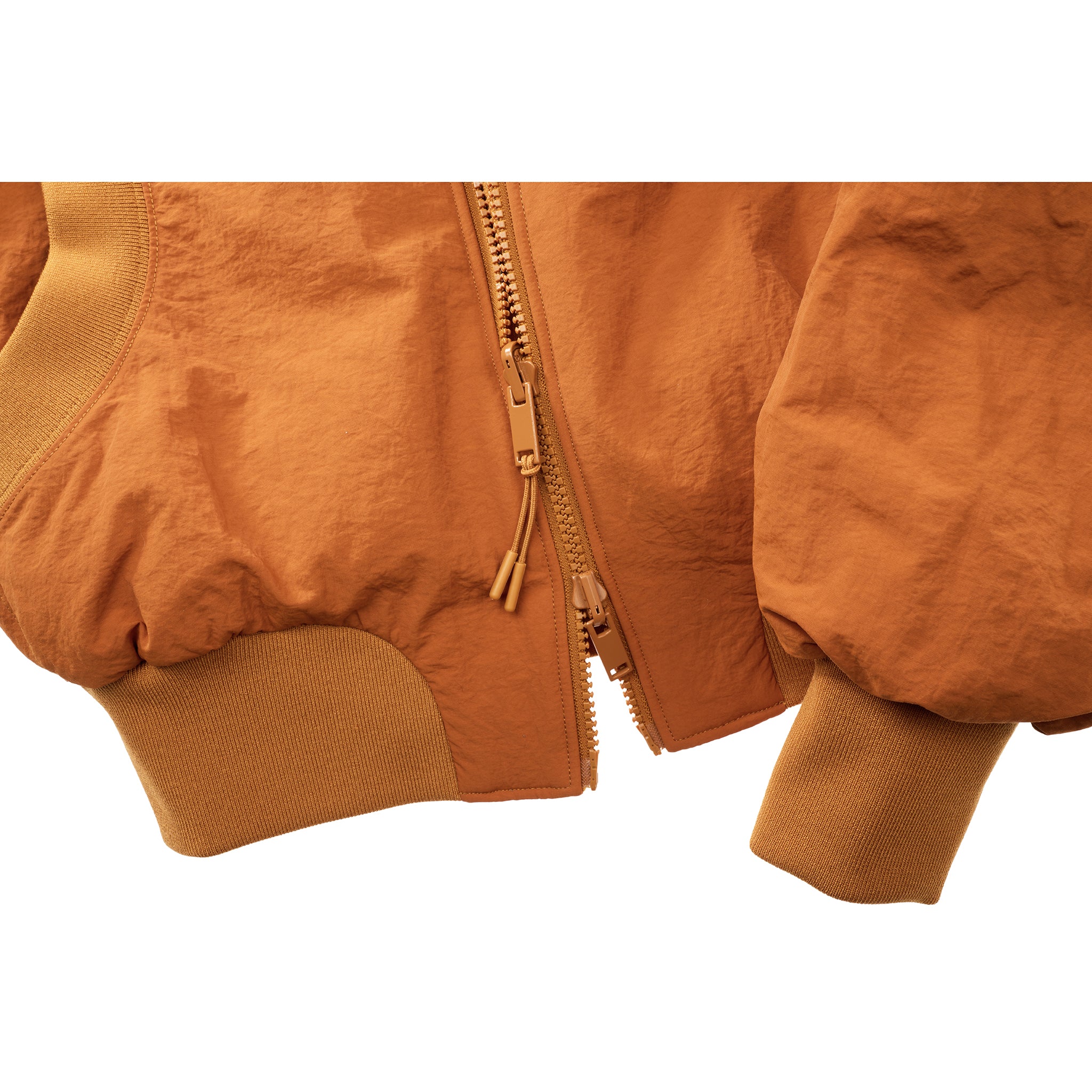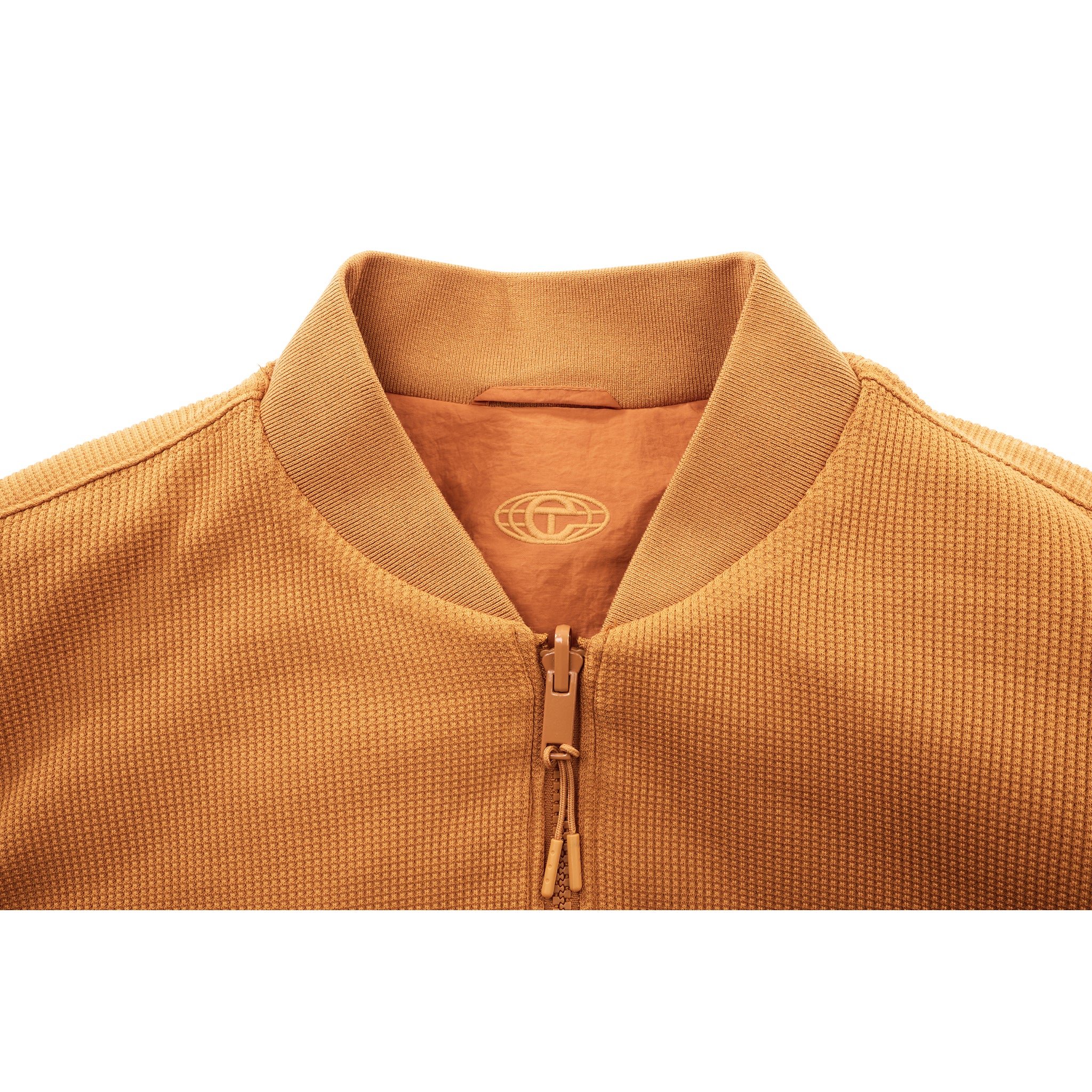 Reversible bomber jacket with water-resistant matte exterior, thermal waffle knit interior. Slit pockets at the side and around the elbows. Ribbed trim at the collar, waistband, cuffs and pockets. Full zipper closure. Available in Black and Rust.