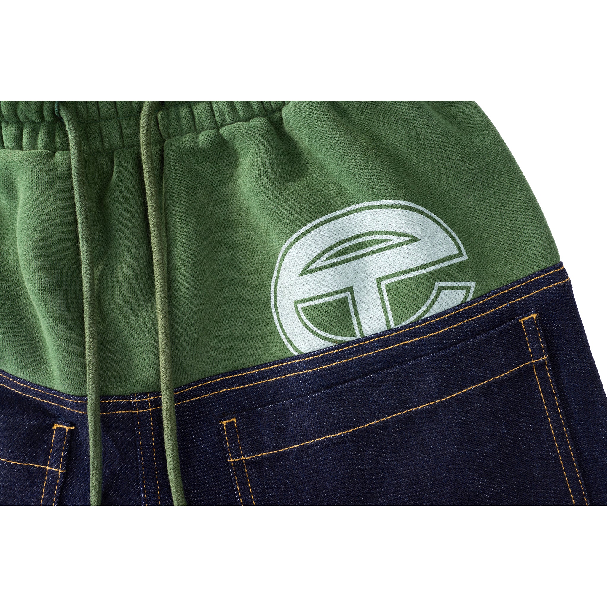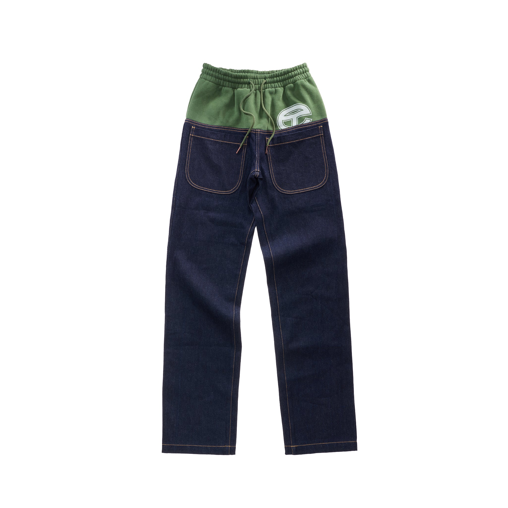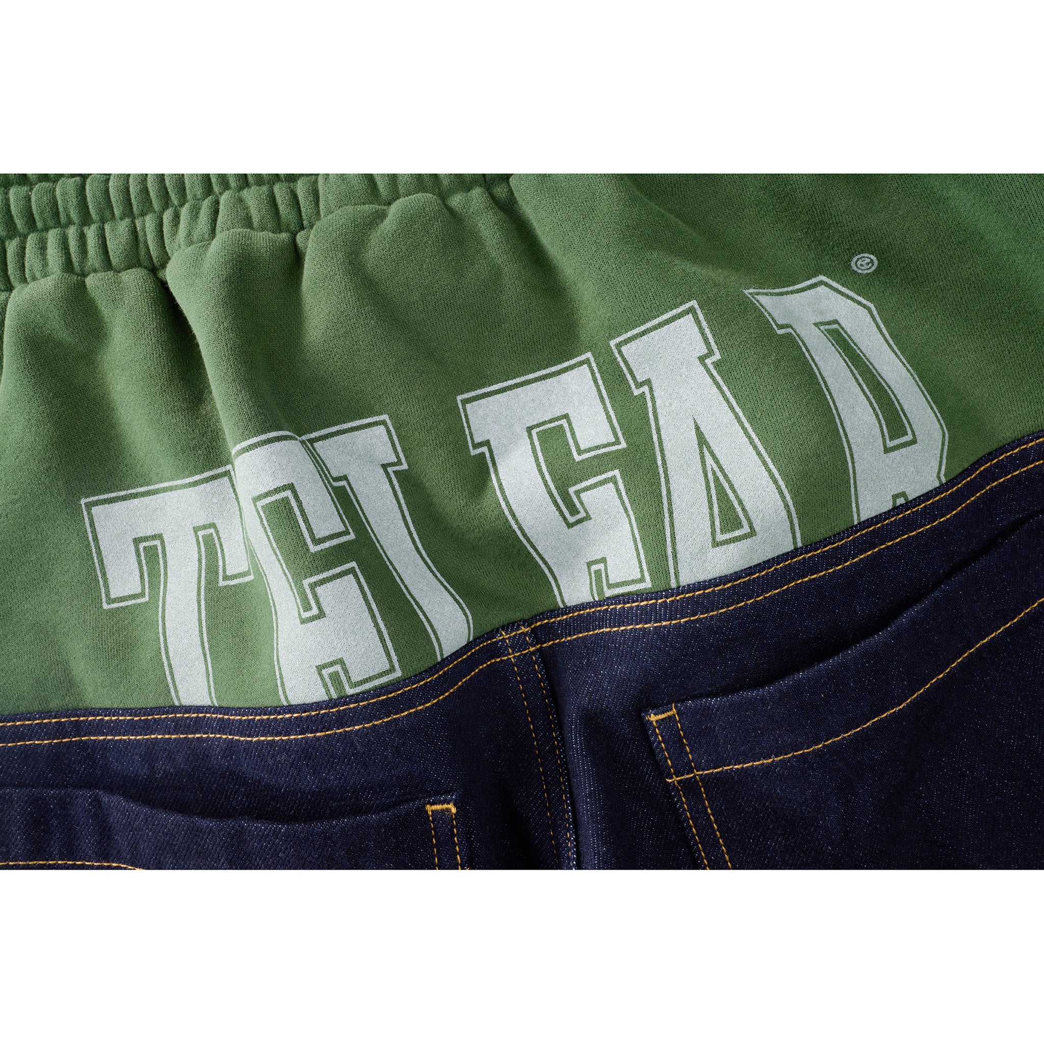The Sweat Jean — featuring tailored raw denim with contrast stitching, hidden belt loops, deep slit pockets and custom hardware closures — transitioning mid-thigh to our classic fleece sweat with tapered fit, logo print, ribbed cuffs and signature leather debossed patch at the back.