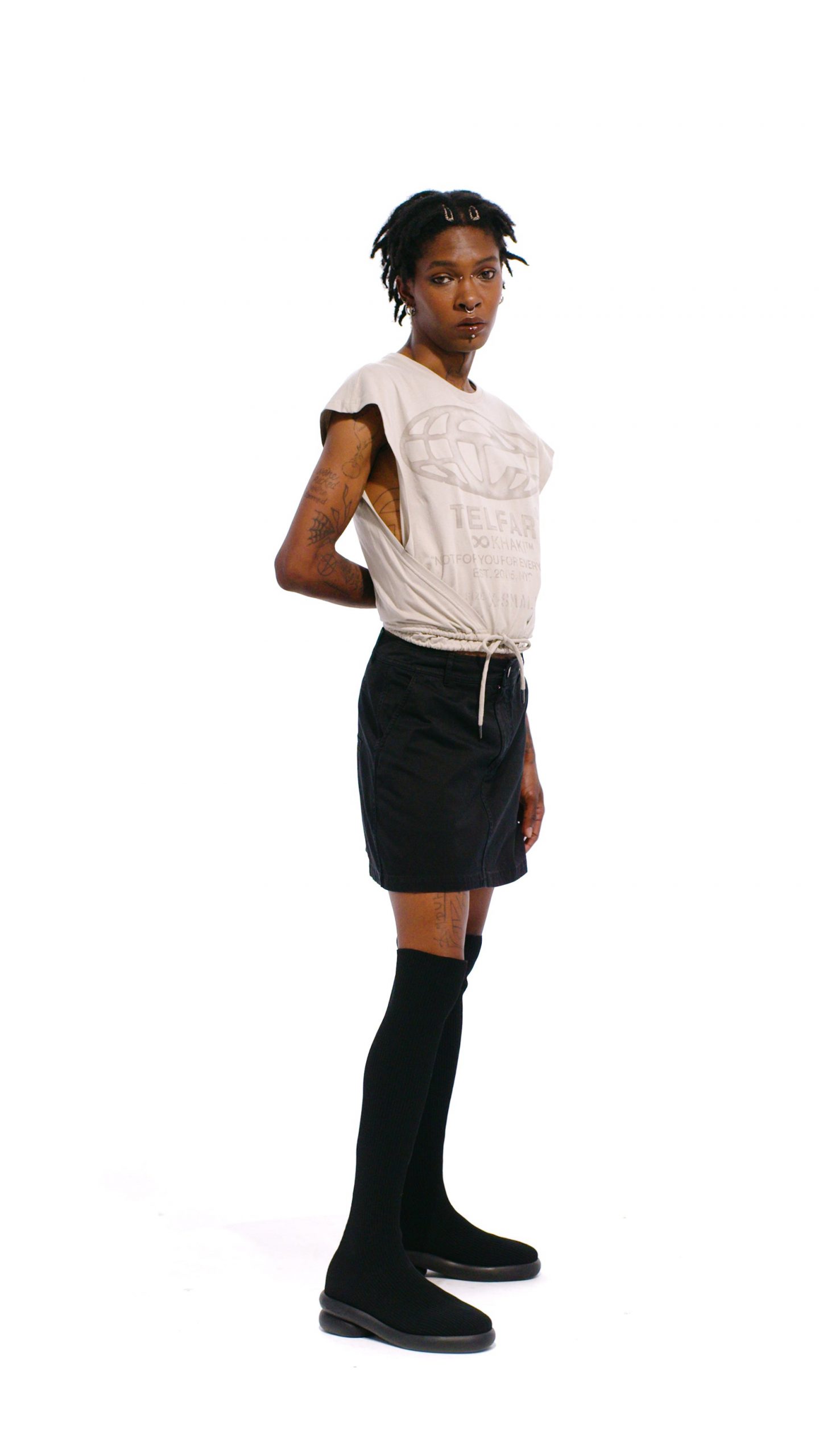 Our unisex Short Work Skirt featuring pockets in the front, slit pockets in back, embroidered insignia, custom hardware and zipper closure.