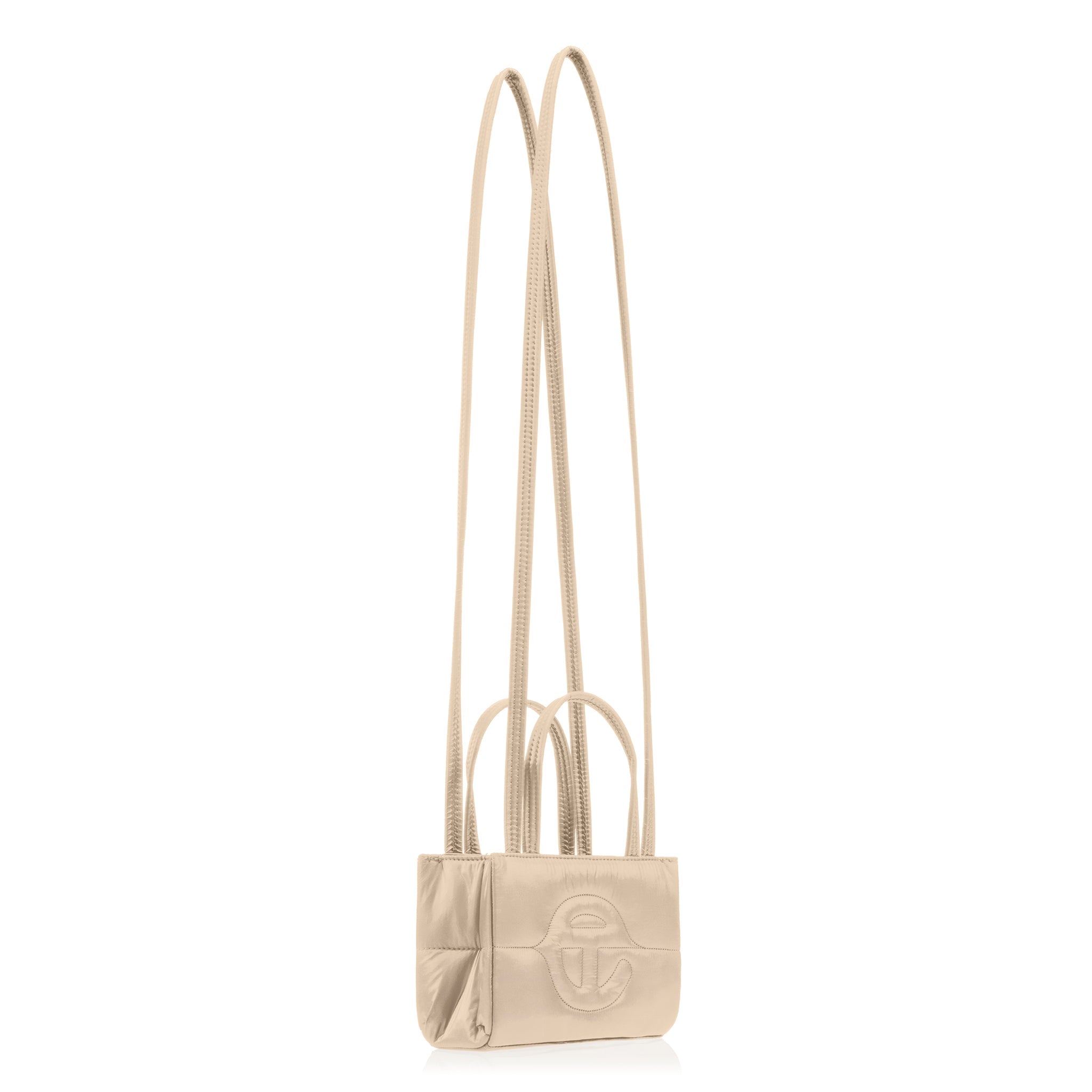 Our iconic Unisex TELFAR Bag, engineered in quilted nylon puff — available for the first time in SMALL size. Featuring a double strap to be held in hand, over the shoulder or cross-body, and a magnetic snap closure.