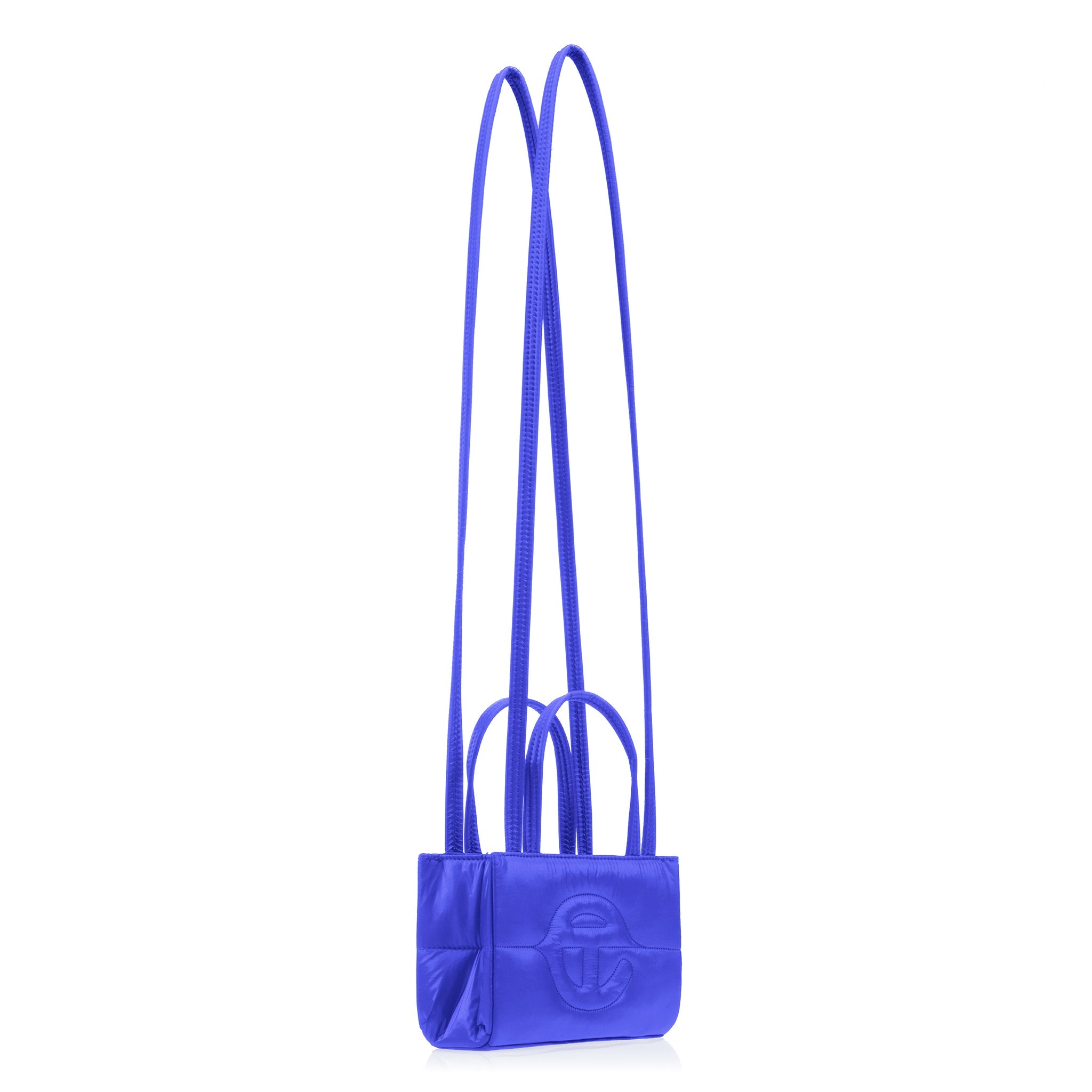 Our iconic Unisex TELFAR Bag, engineered in quilted nylon puff — available for the first time in SMALL size. Featuring a double strap to be held in hand, over the shoulder or cross-body, and a magnetic snap closure.