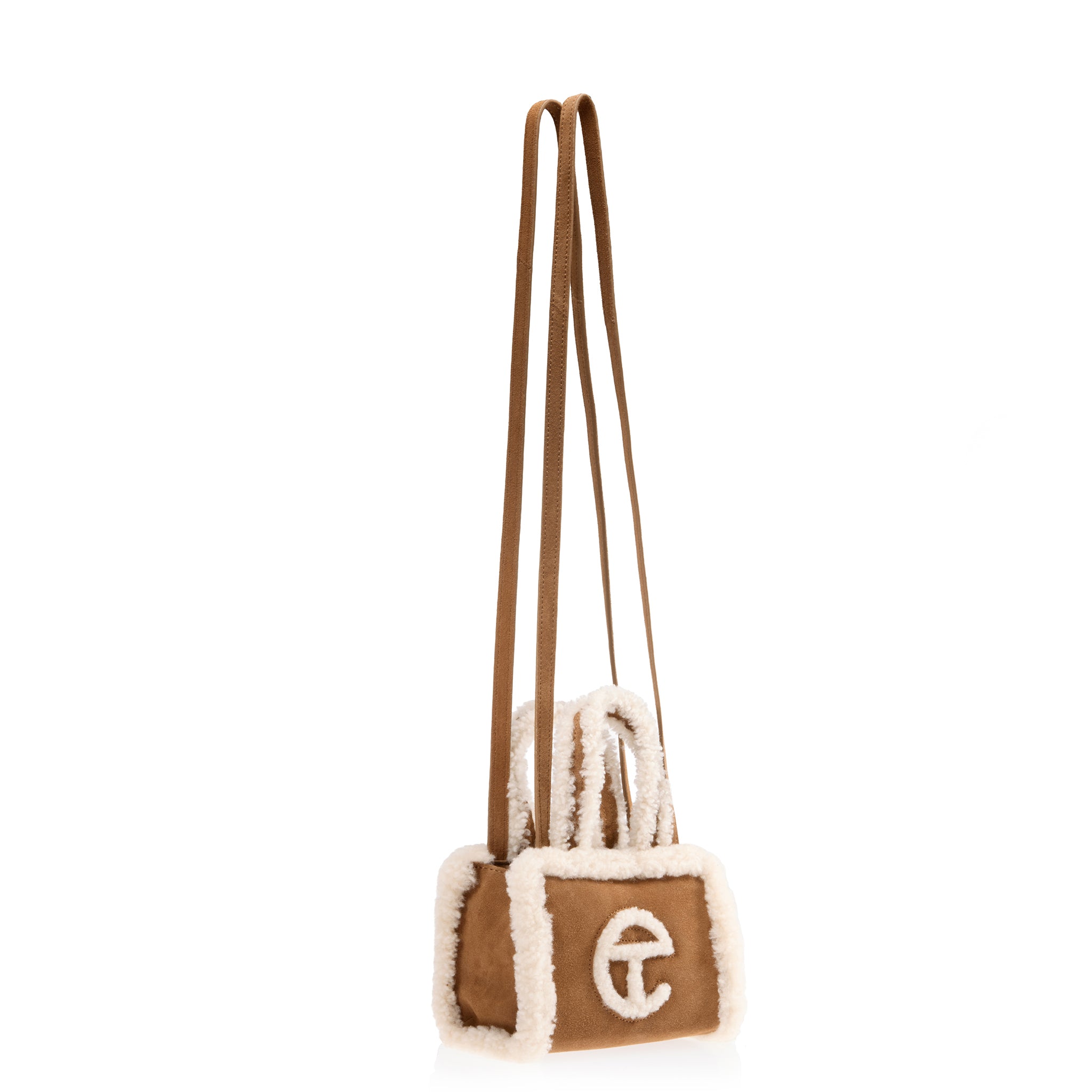 The Small Shearling Shopper – made in roasted chestnut suede with a cuddly shearling trim. Featuring a double strap (handles and crossbody straps), inlaid shearling TELFAR logo at the front, 100% cotton lining with interior zipper pocket, hidden magnetic snap closure and debossed leather patch on back panel.