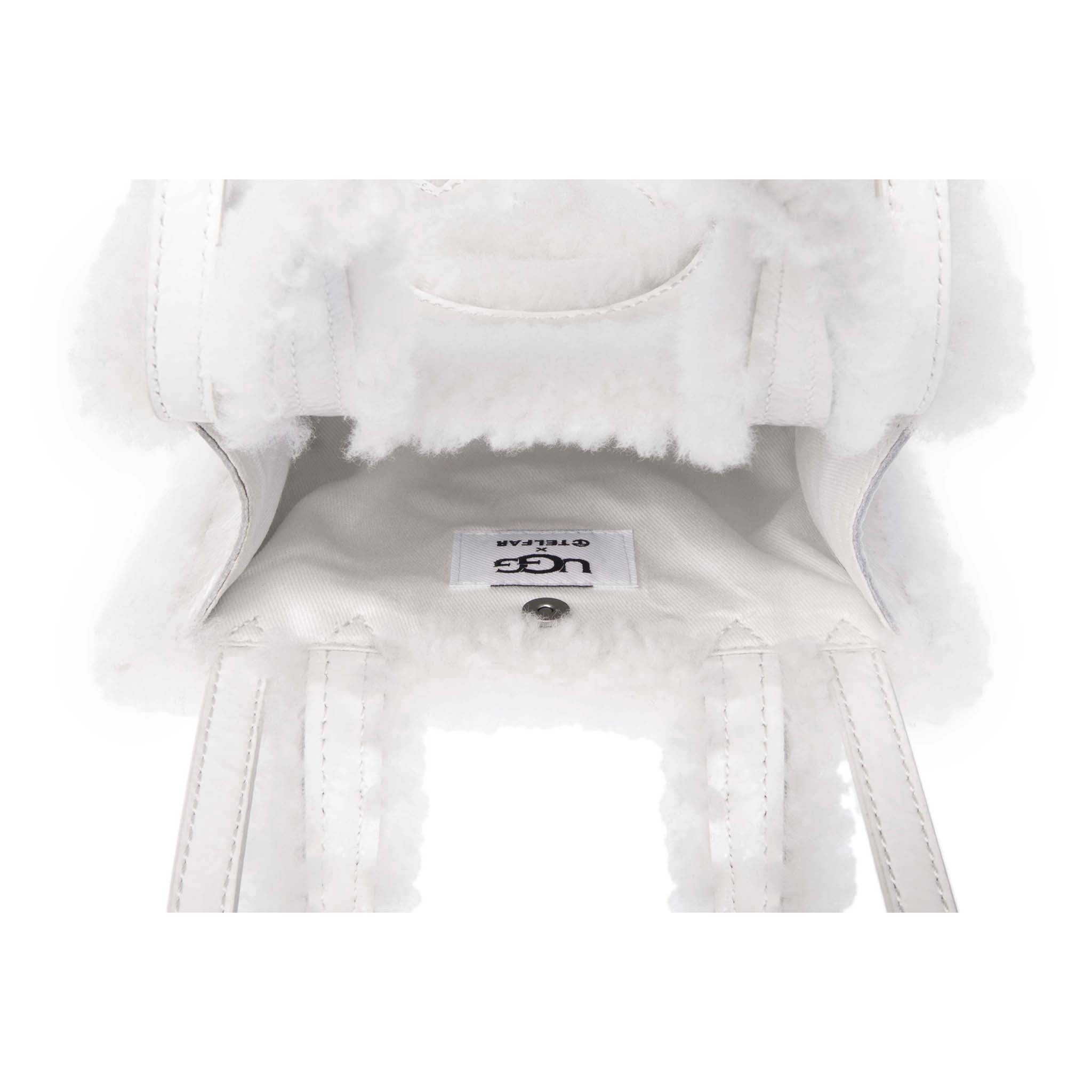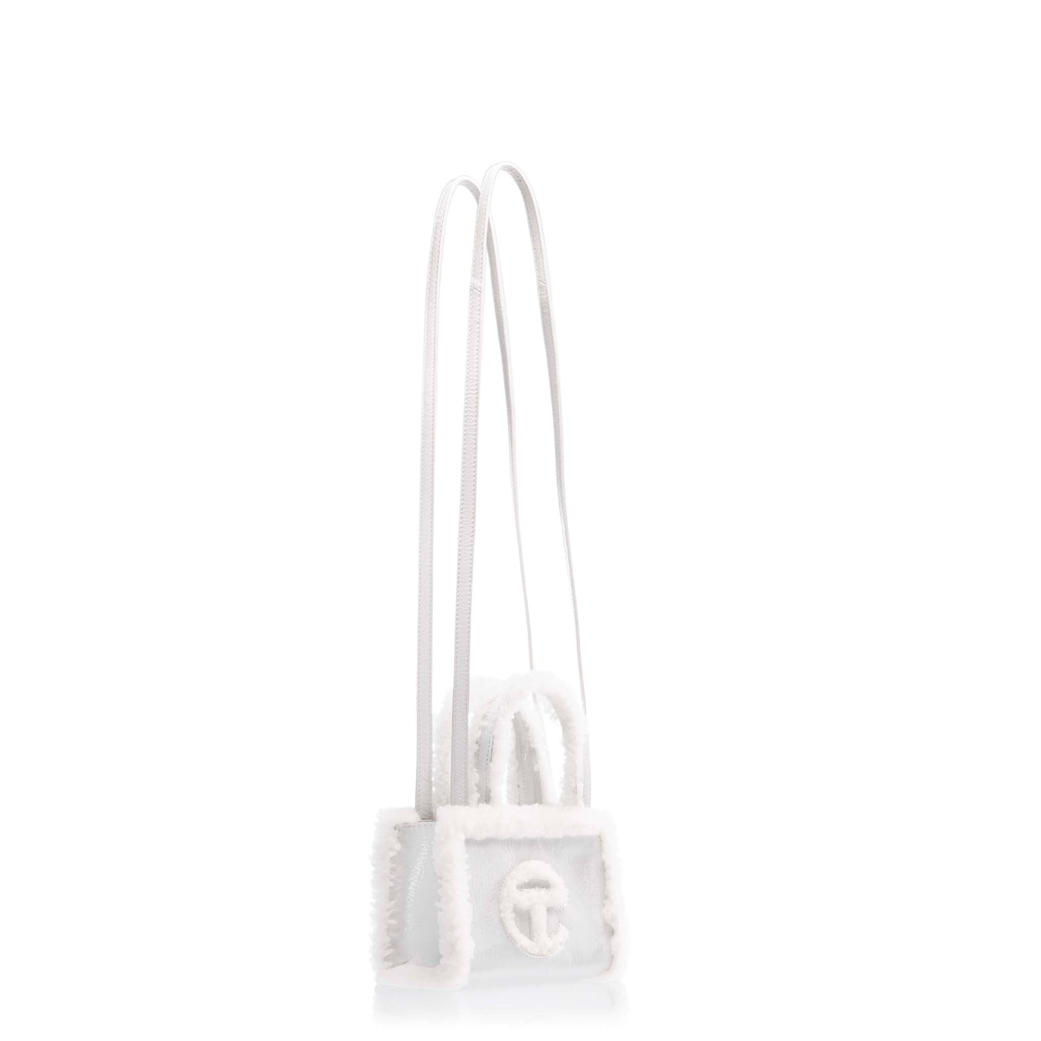 Our iconic UGG x TELFAR shopper in crinkle patent leather with a cuddly genuine shearling trim. Bag features double strap to be worn cross-body, inner zip compartment and magnetic snap closure.