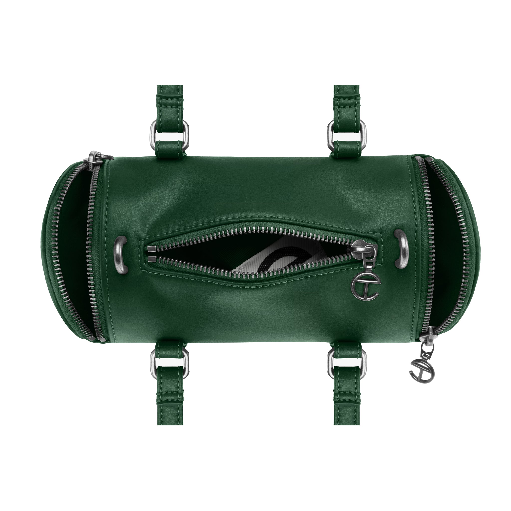 The Small TELFAR Duffle is a universal unisex icon in faux leather, in an irresistible fun-size that’s fully functional for any function and beyond. Featuring embossed TC logo side pockets on both ends, a generous interior with inner pocket, custom antique silver hardware and logo zipper pulls, twin handles and a detachable shoulder strap.