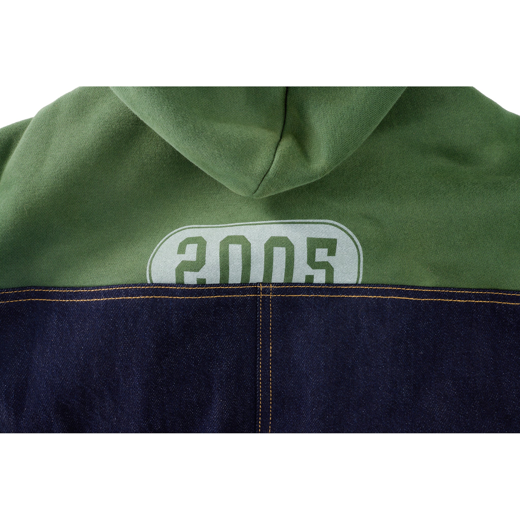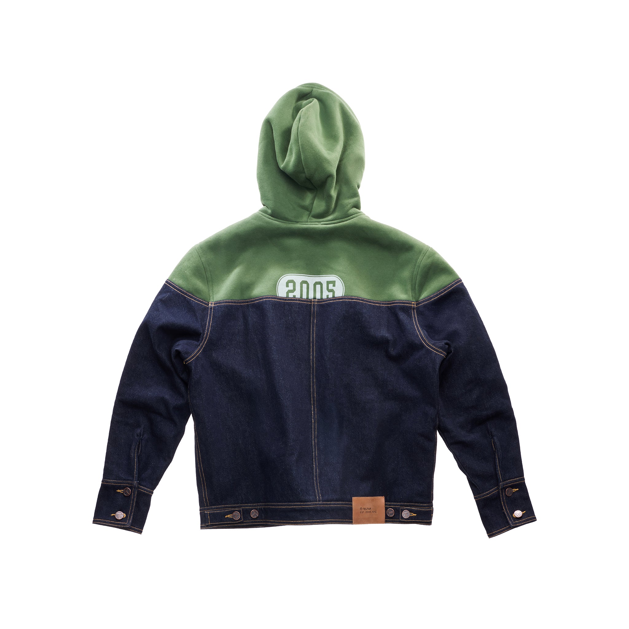 The Sweat Jean Jacket — featuring a super soft fleece shoulder with logo print that transitions seamlessly to a classic raw denim silhouette with contrast stitching. Includes four deep pockets with custom hardware, full zipper closure, adjustable drawstrings, and signature leather debossed patch at the back.