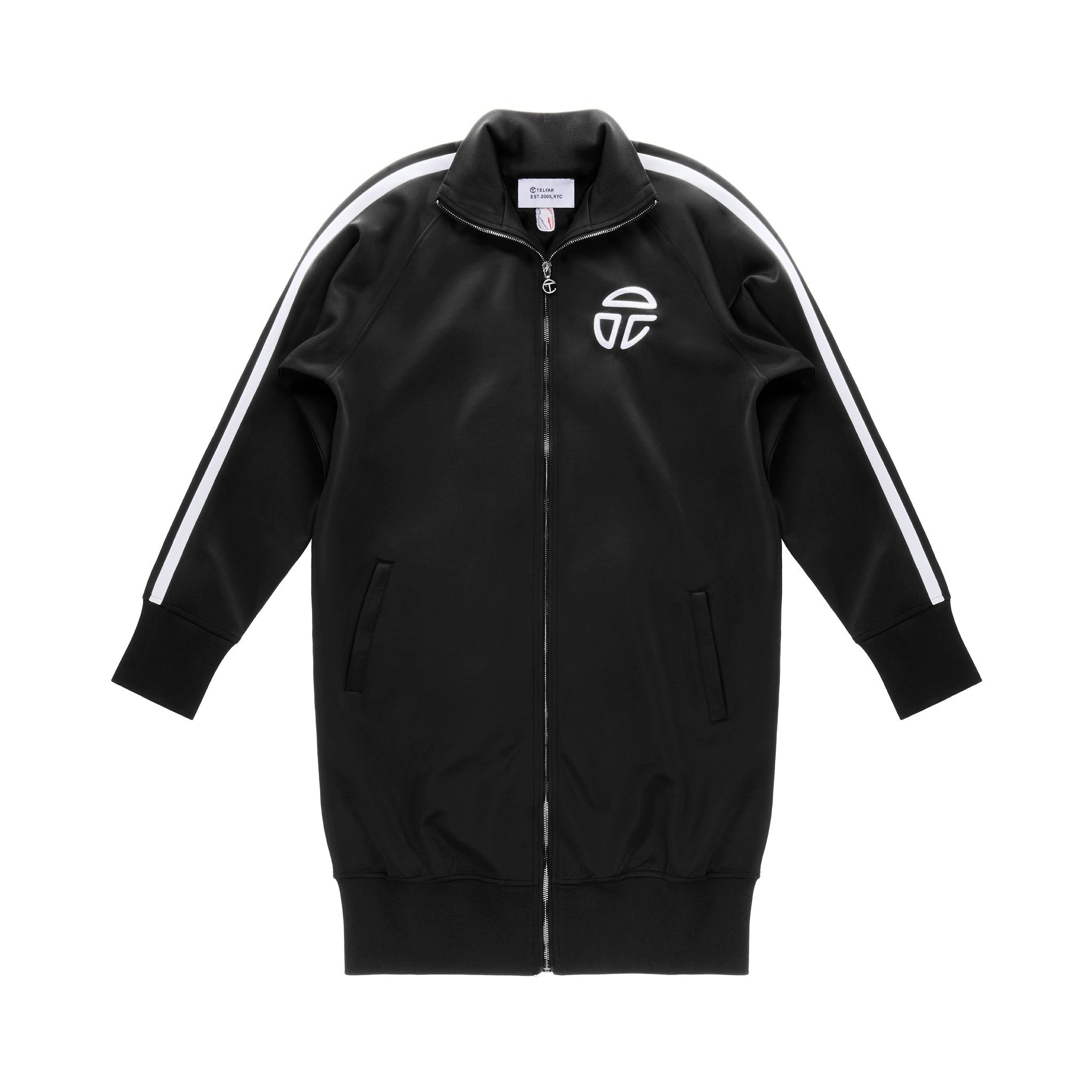Long-line track jacket featuring sculptural stripes on the sleeves, athletic logo embroidery on the chest, logo zipper pull, welt pockets with zipper closure, ribbed collar, cuffs and waistband.