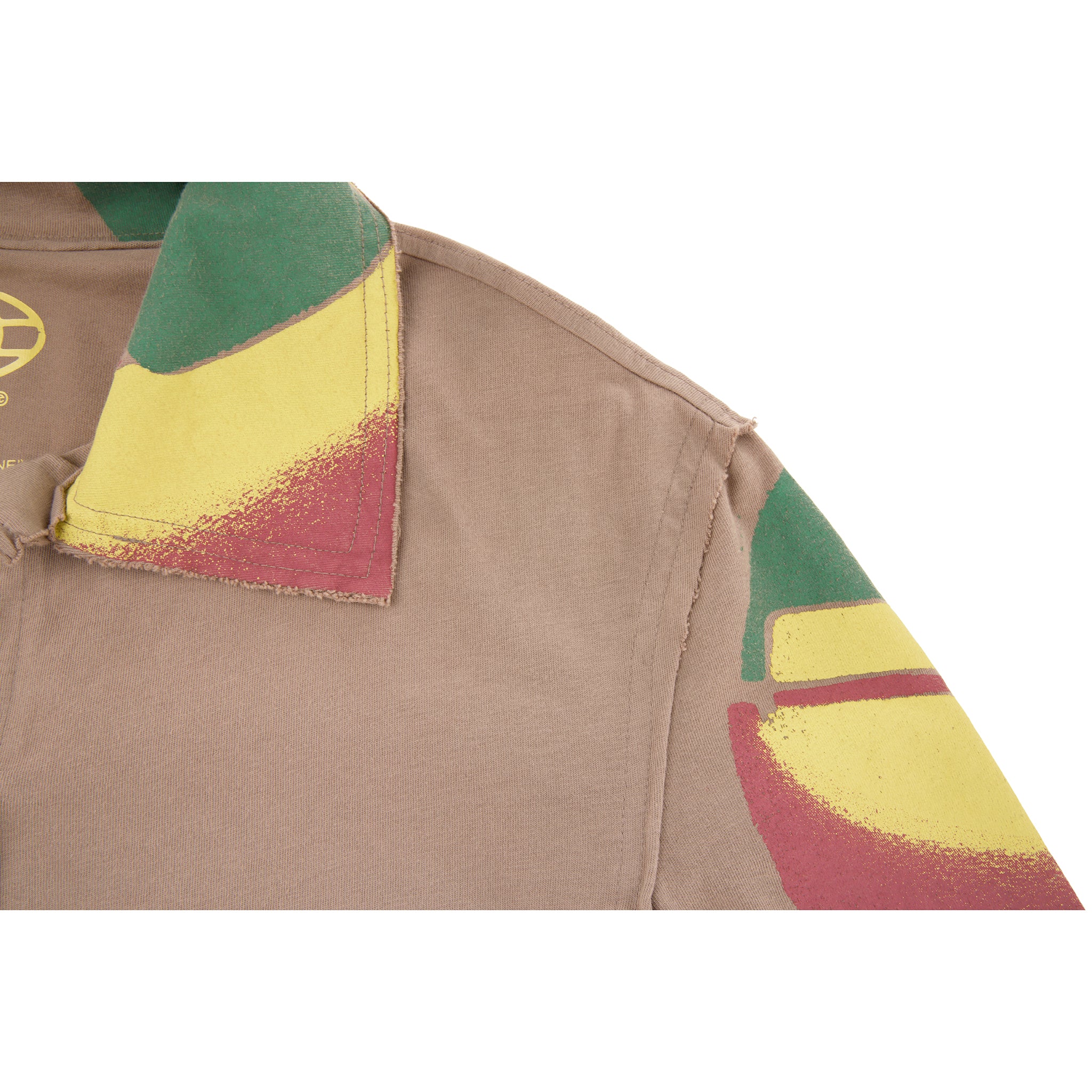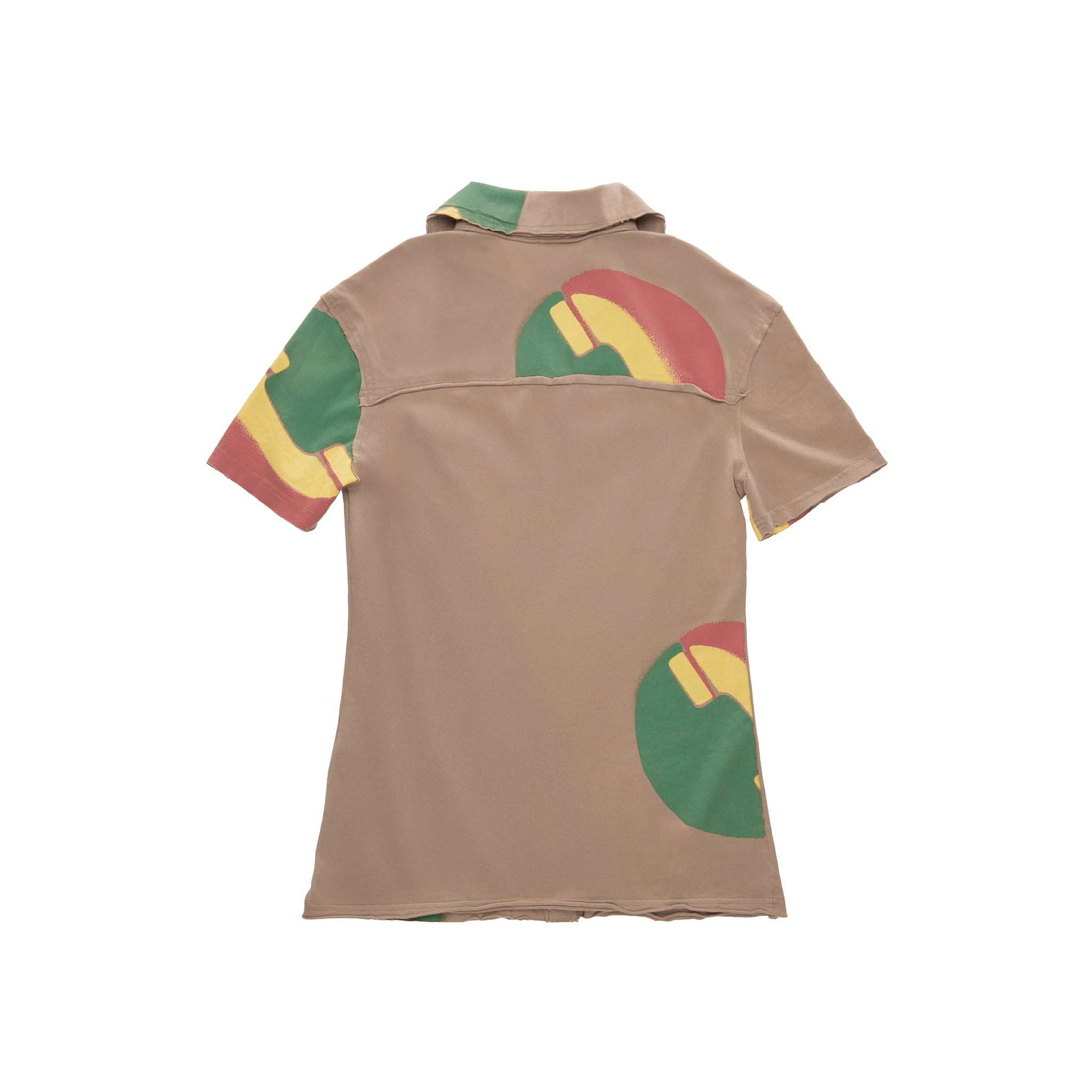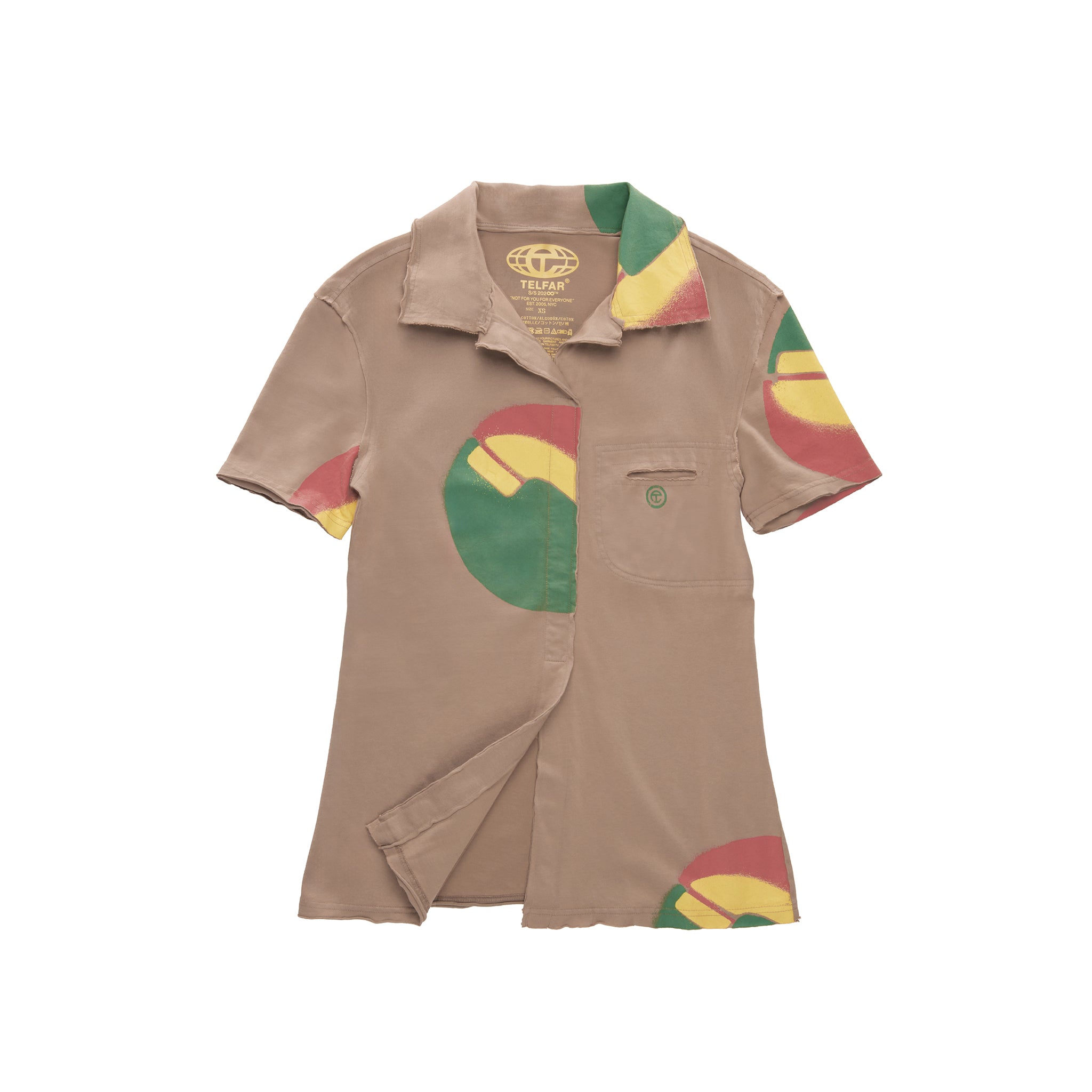 The Split T Dress Shirt – featuring our signature Telephone print on 100% ultra-soft jersey cotton. Constructed with a classic collar, short sleeves, chest pocket and forming a relaxed fit with hidden button closures, exposed seams and raw edges.