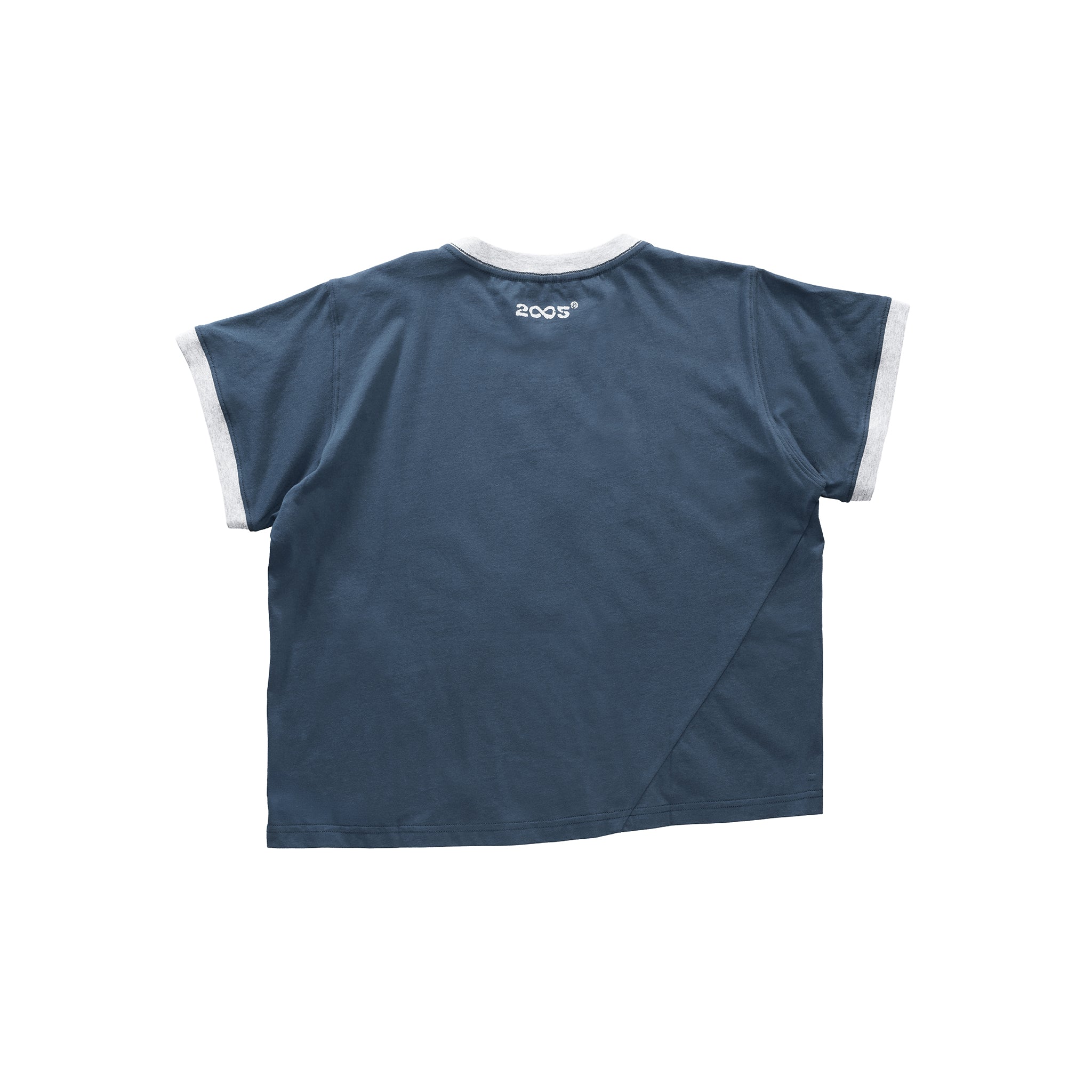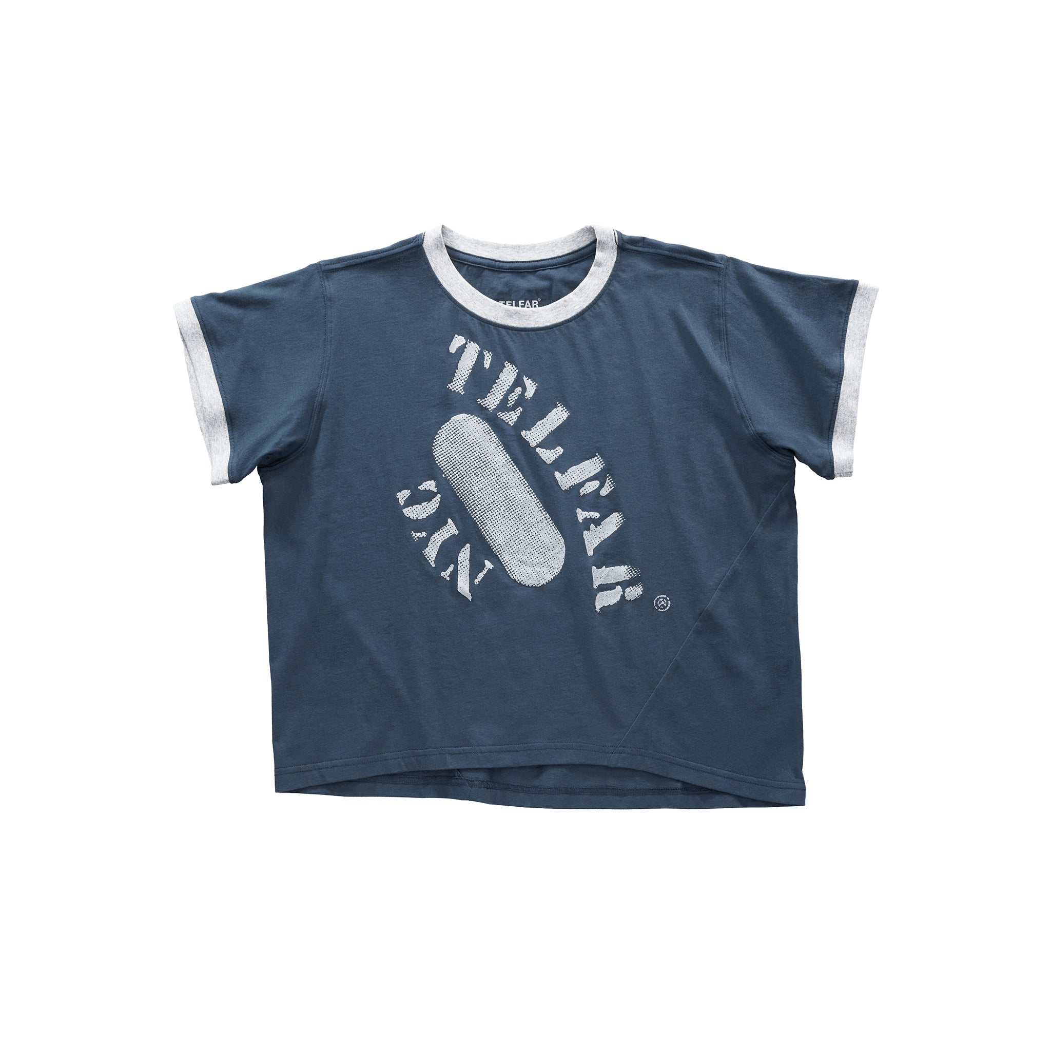 Our cropped and boxy crew-neck Twisted Ringer T in ultra-soft knit jersey cotton. Featuring ribbed collar and sleeves with contrast edges, asymmetrical side seams and hemline, and our signature screen printed logo.