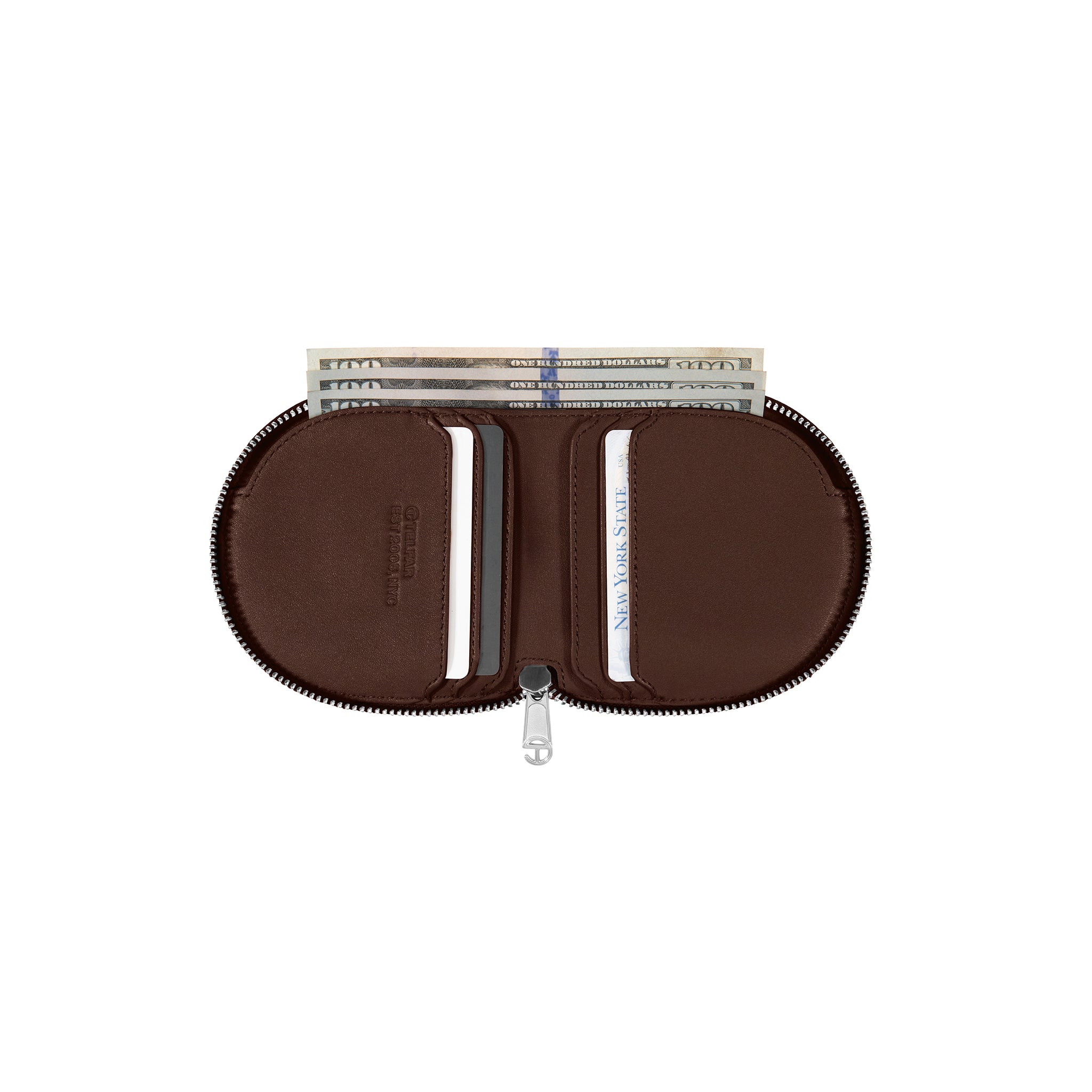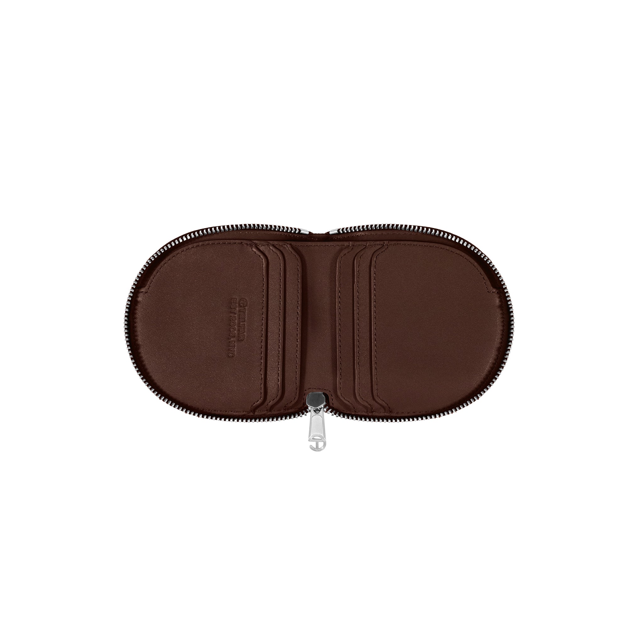 You kept asking us to make a wallet. We took our time and did it right: 100% top grain leather logo-embossed billfold wallet with logo zip, six card compartments, generous cash pocket and semi-circular shape make the TELFAR Wallet an instant icon.