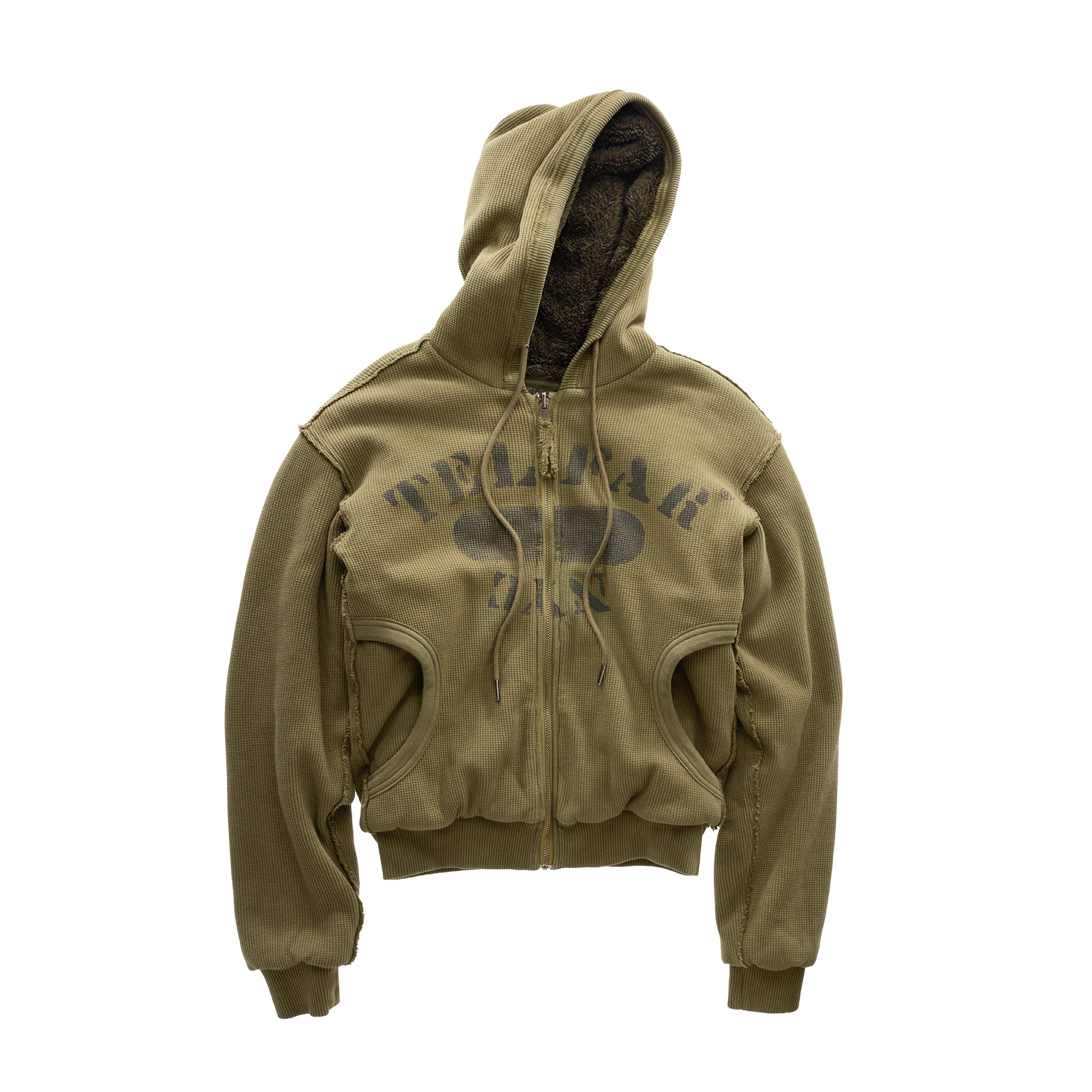 Our Thermal Sherpa Hoodie — designed with reversible extra-heavy waffle knit and ultra-soft sherpa with signature Cracked print. Featuring contrast edges with distressed seams, adjustable drawstring hood, full zip closure and ribbed front pockets.