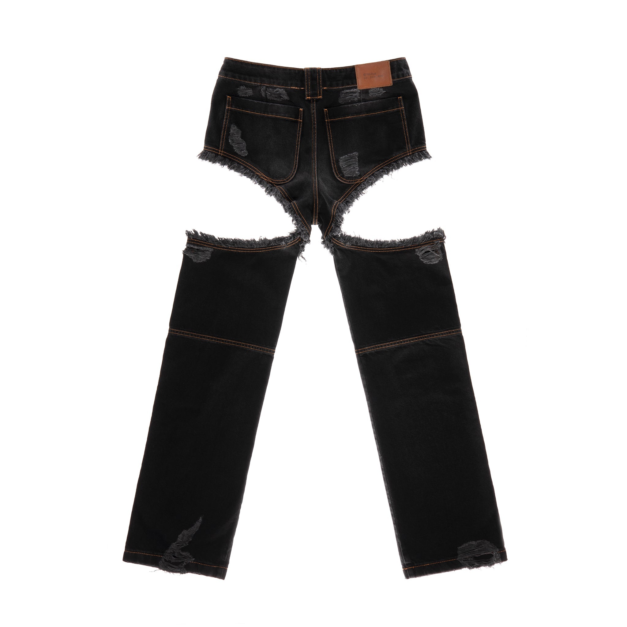 Our iconic Thigh-Hole Jean silhouette featuring signature cutout thighs, cut-off back pockets, hidden belt loop stash compartments, custom hardware and debossed leather patch in back. Available in blue and black washed denim.