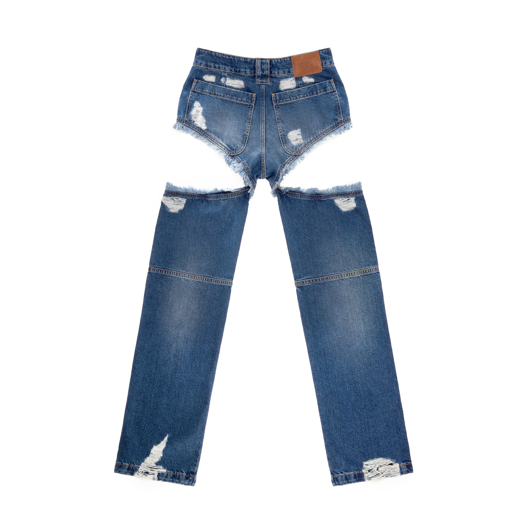 Our iconic Thigh-Hole Jean silhouette featuring signature cutout thighs, cut-off back pockets, hidden belt loop stash compartments, custom hardware and debossed leather patch in back. Available in blue and black washed denim.