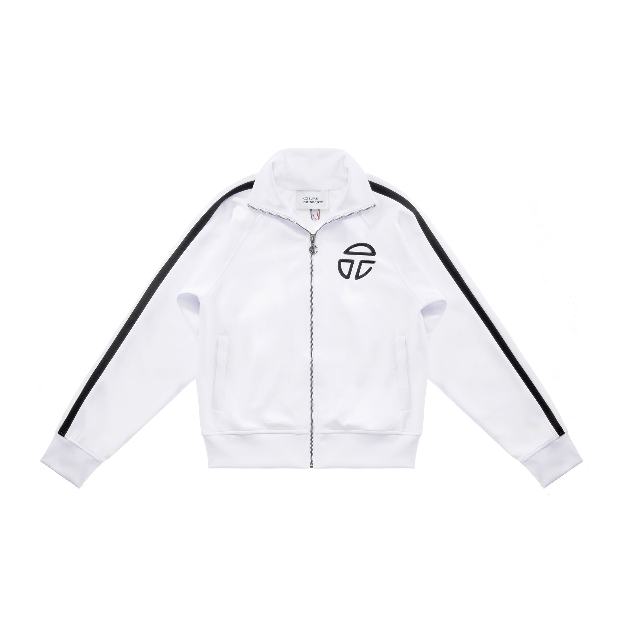 Classic track jacket featuring sculptural stripes on the sleeves, athletic logo embroidery on the chest, logo zipper pull, welt pockets with zipper closures, ribbed collar, cuffs and waistband.