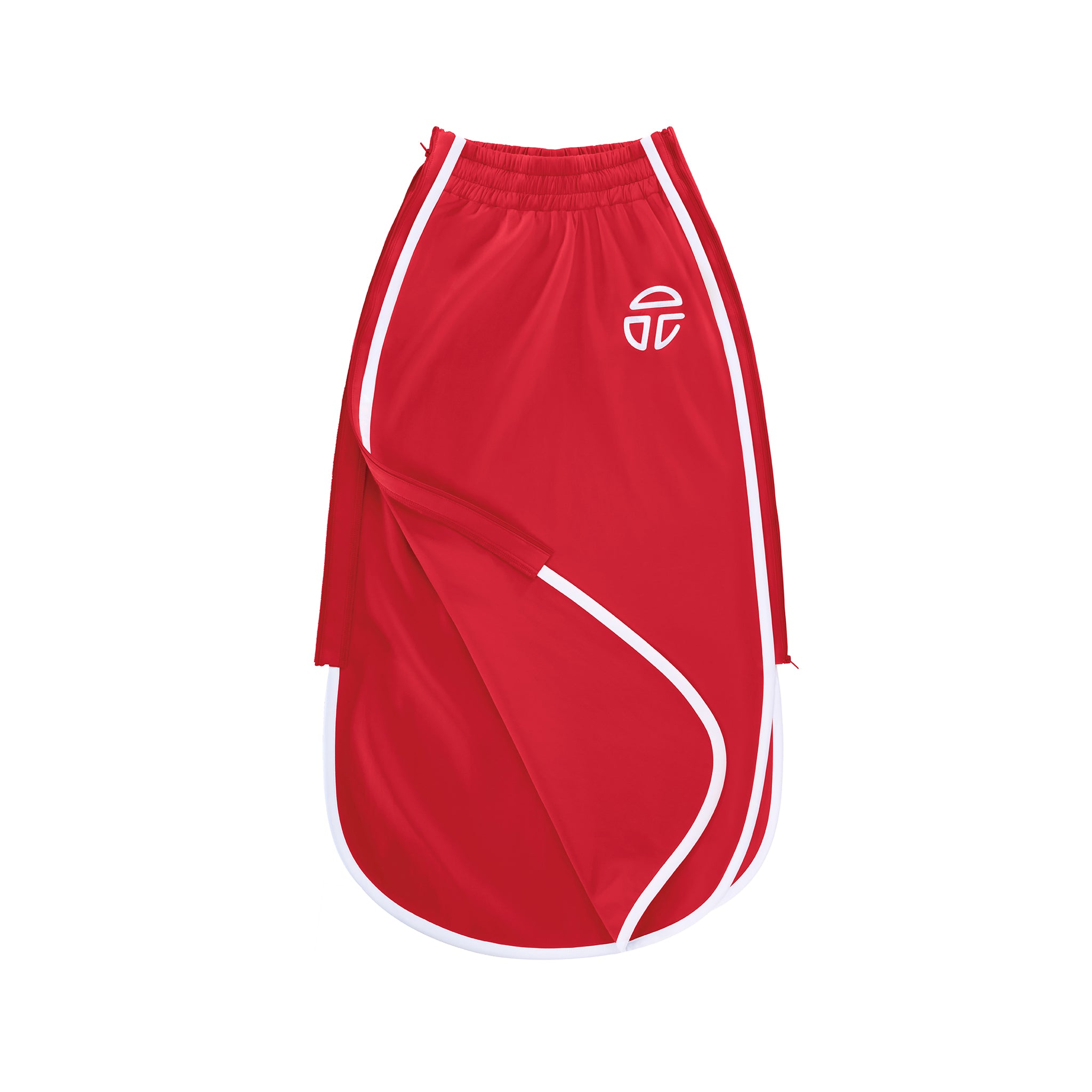 Our Track Long Skirt featuring sculptural stripes, athletic logo embroidery, elastic waist, and hidden zip pockets in front and back with side panels that unzip to fully separate.