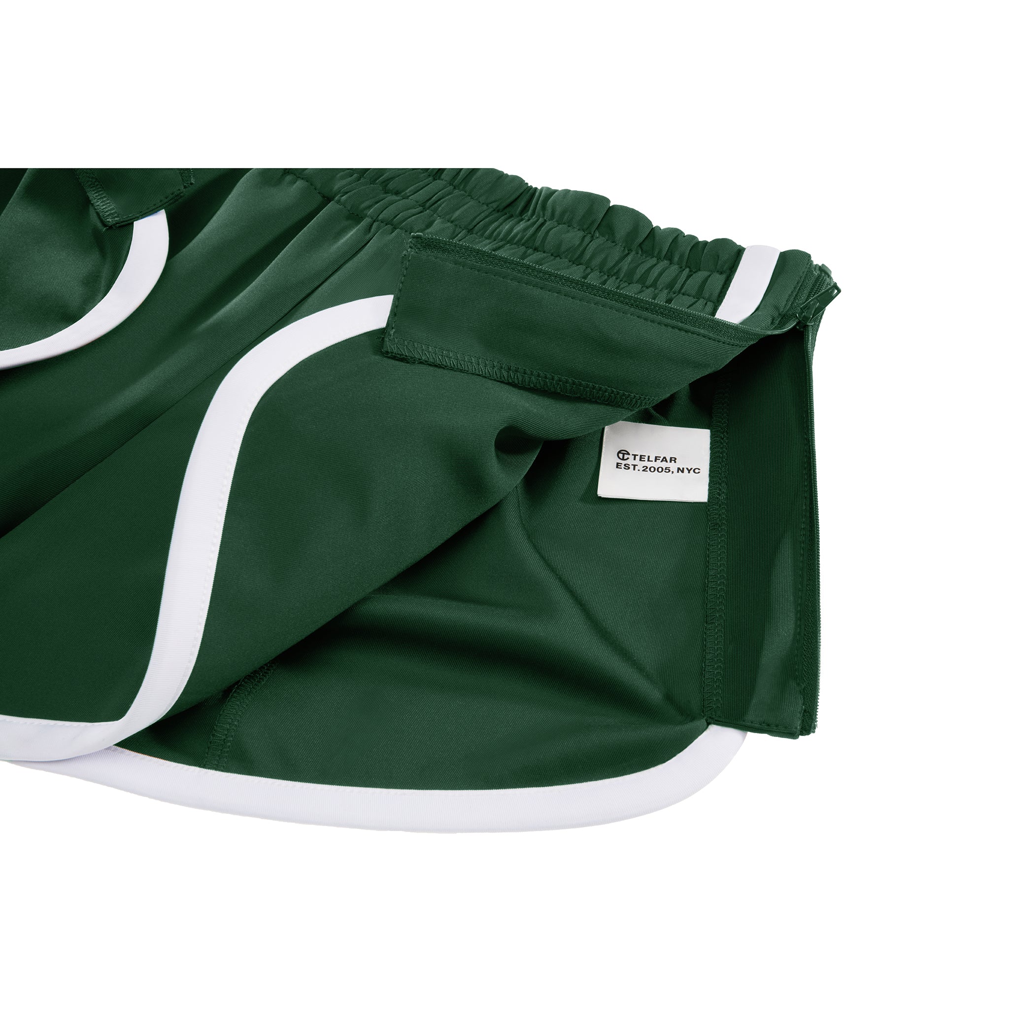 Classic running short featuring sculptural stripes, hidden zip pockets in front and back, full zipper side panels, and athletic logo embroidery on the hip.