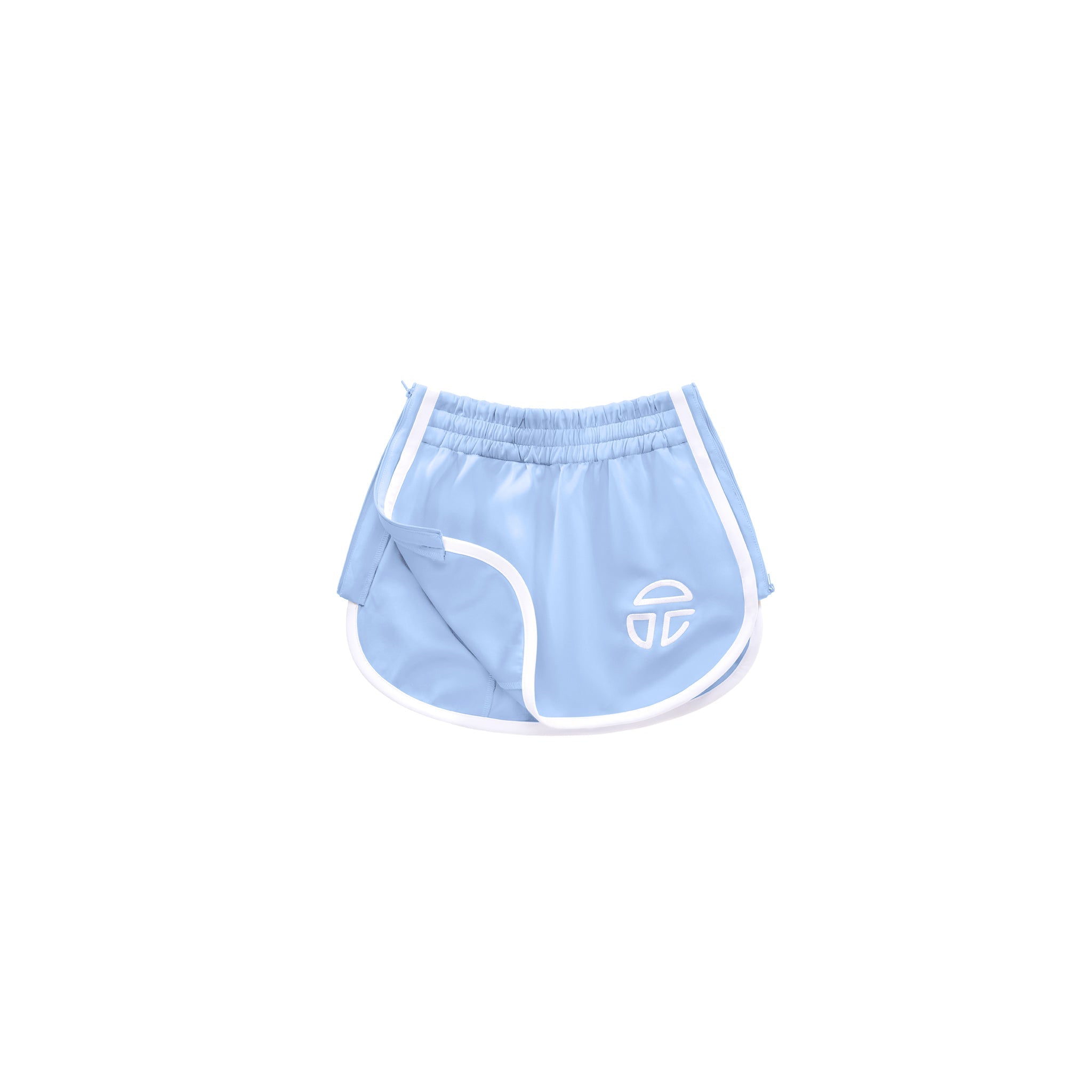 Classic Track Short Skirt featuring sculptural stripes, athletic logo embroidery, elastic waist and hidden zip pockets in front and back with side panels that unzip to fully separate.