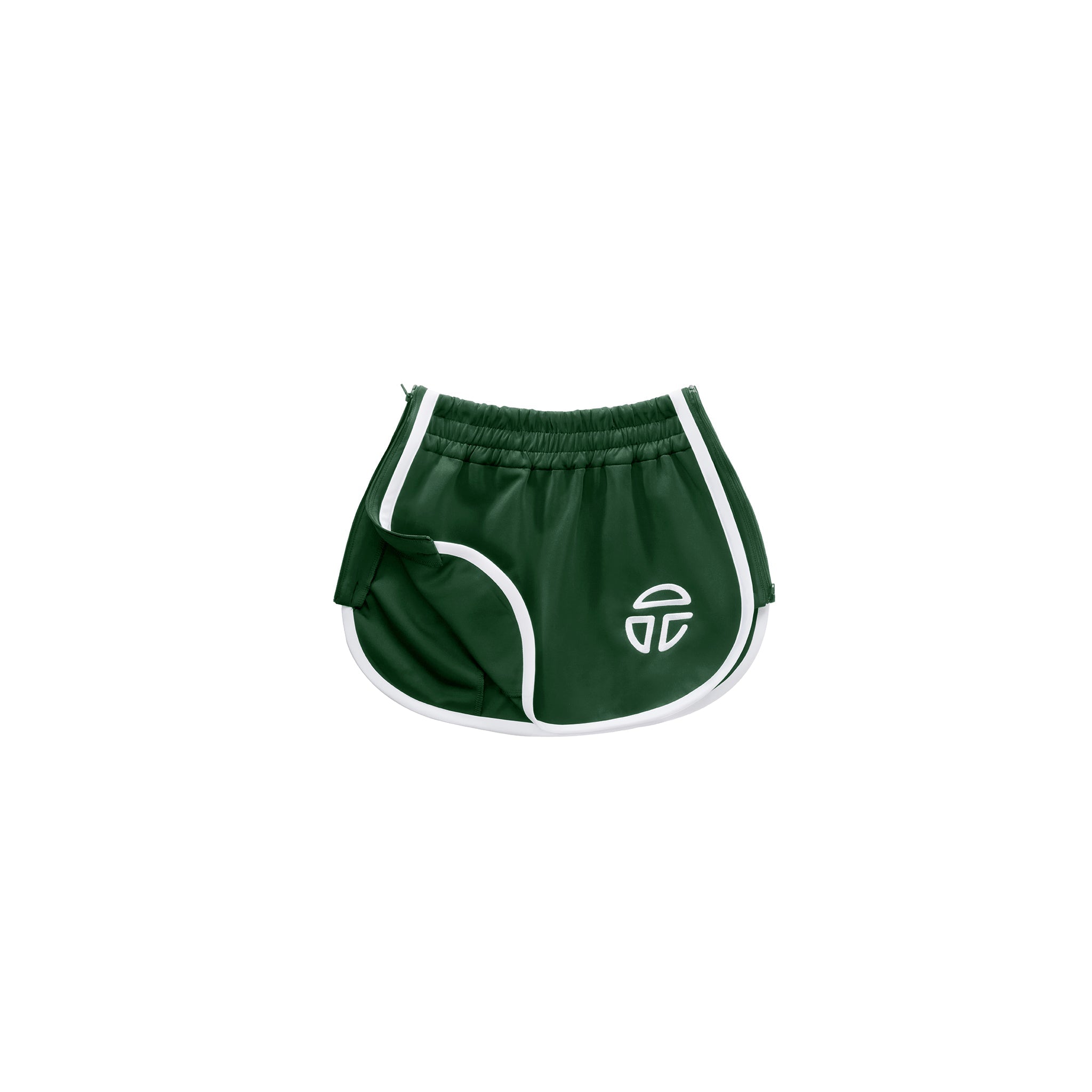 Classic Track Short Skirt featuring sculptural stripes, athletic logo embroidery, elastic waist and hidden zip pockets in front and back with side panels that unzip to fully separate.