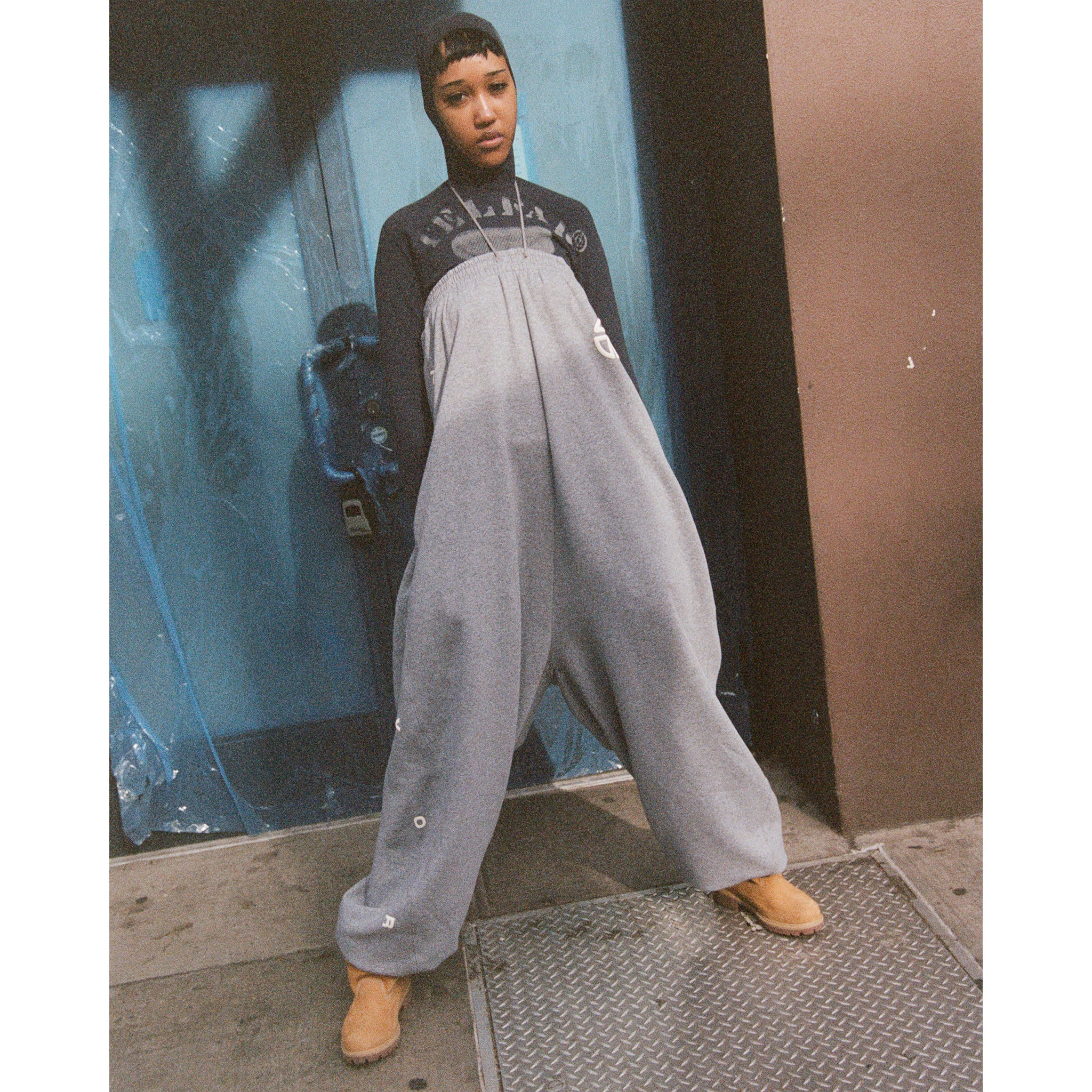 Sleeveless fleece jumpsuit with adjustable drawstring tie closure at the bust. Drop waist. Tonal seams. Hidden slit pockets. Signature silkscreen Afro-sport insignia at the front panel and NewYork insignia at the side. Balloon pant silhouette. Available in Black and Grey.