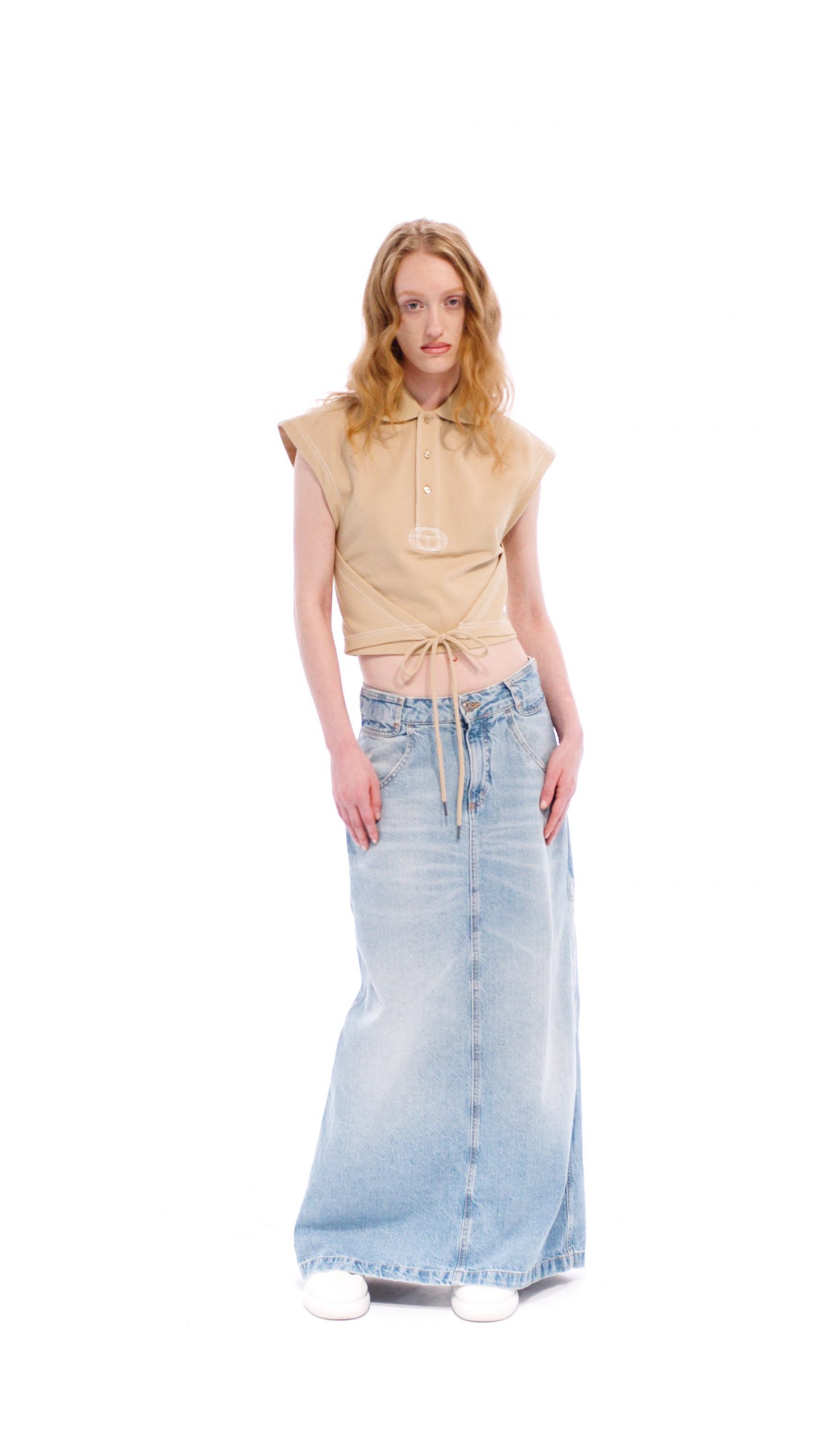 The Wrap Polo builds on our signature sideless wrap T silhouette. Designed with a rib knit collar, cap sleeves, and open sides that wrap and tie at the front. Featuring custom tonal buttons and embroidered insignia.